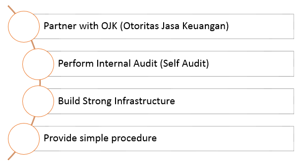 TCASH team collaborate with OJK (Otoritas Jasa Keuangan, Financial Services Authority) so that OJK team can audit financial services activity of TCASH. TCASH team also perform internal audit (self audit).
