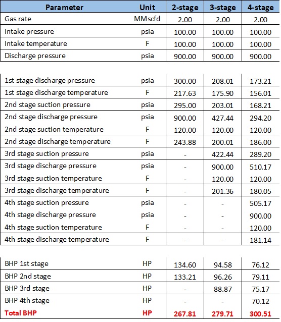 So, back to the case we use. We can conclude that 2-stage reciprocating compressor is suitable for the case. The discharge temperature for each stage is below 275-300oF.