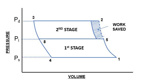 The work required to compress gas is given by the area of the pressure vs volume diagram. Figure above shows a single- and a two-stage compression for a given application. The diagram for single stage compression is 1-2-3-4-1. For two-stage compression, it is 1-5-6-7-3-8-4-1. As the interstage gas is cooled (5-6), its volume decreases. The work done as given by the areas of the diagrams is obviously less in the two-stage case than in the single-stage case. Further, if any liquids are condensed out of the gas in the intercoolers, the liquids must be separated from the gas and the mass of gas compressed from the interstage to the final discharge is reduced with a further resulting power reduction. However, as stages are added, the number of compressor valves the gas must flow through in series, and the amount of interstage piping and coolers increase. If too many stages are used, the pressure losses in the valves and piping will offset the gains from intercooling and the efficiency will be reduced.