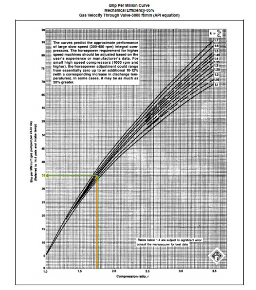 BHP per MMcfd is a function of compression ratio and K value. BHP per MMcfd read from figure below use a pressure base of 14.4 psia.