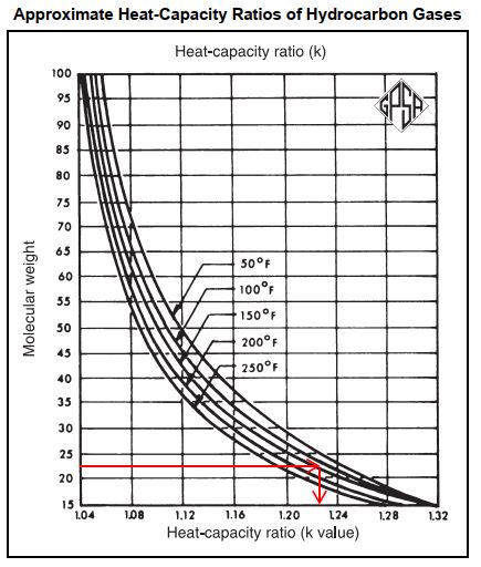 K value or heat-capacity ratio is function of molecular weight and temperature. We will determine K value by curve. For most compression application, 150oF curve will be adequate. This should be checked after determining the average cylinder temperature.