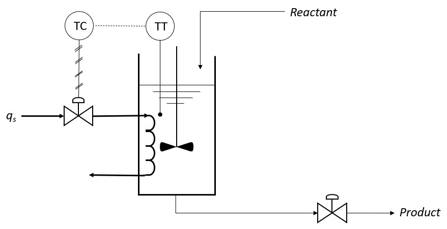 In a polymerization reactor, if the temperature of the reacting mixture falls below a limit, the viscosity increases, and the mixture may solidify. Safety requires a fail-open valve corresponding to negative Kv (control valve action). The process gain is positive (Kp>0), as the steam flow rate supplied to the heating coil increases, the temperature increases. Assuming that the sensor gain is positive (Km>0), to ensure that the overall gain of the control system remains positive, KcKvKpKm> 0, the controller gain (Kc) must be negative, that is the controller will be direct acting.