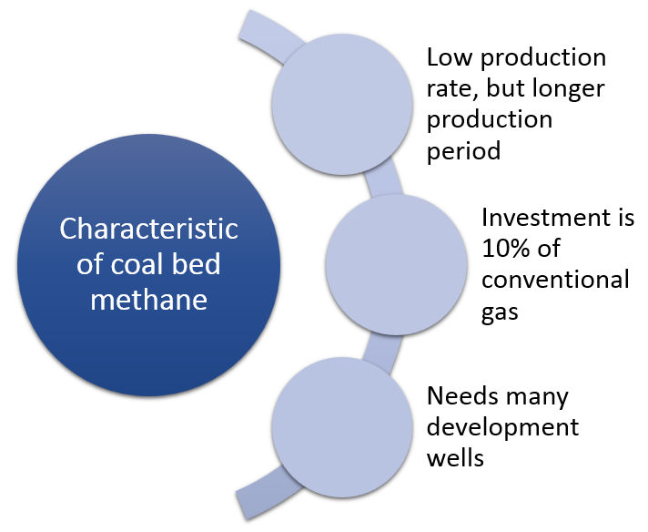 Coal bed methane has unique characteristics that make it different from conventional gas. It has low production rate, but longer production period. The production period can be as long as 20 years. Investment for coal bed methane is approximately 10% of investment of conventional gas. However, coal bed methane needs many development wells. In conclusion, coal bed methane has excellent economic value for long period.