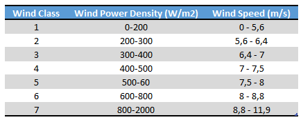 US department of energy made wind mapping, in terms of wind classes, wind speed, and power density at 50 m above the ground.