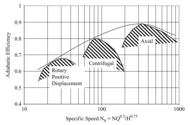 Figure above shows that for centrifugal compressor, adiabatic efficiency is ranging from 60% to 80%. For preliminary calculation we choose 70% adiabatic efficiency.