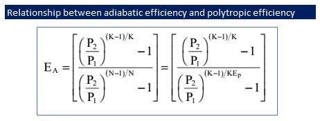 To calculate power by using polytropic head, we need polytropic efficiency. Polytropic efficiency is a function of adiabatic efficiency. Relationship between those efficiency is expressed in equation below.