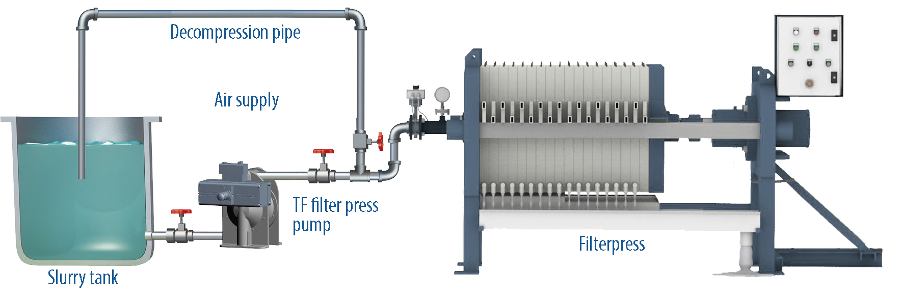 The Larox belt filter is a discontinuous pressure filter that separates, compresses, washes, and automatically discharges the cake. Filtration takes place in from 2-20 horizontal chambers, set one above the other. A belt of filter cloth passes through the filter chambers in turn.