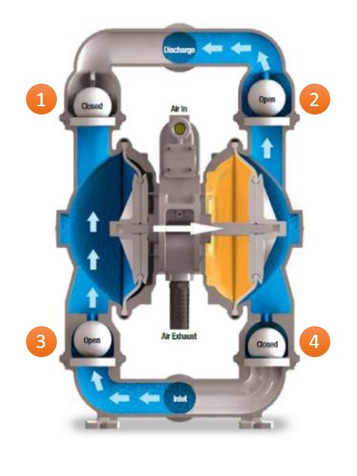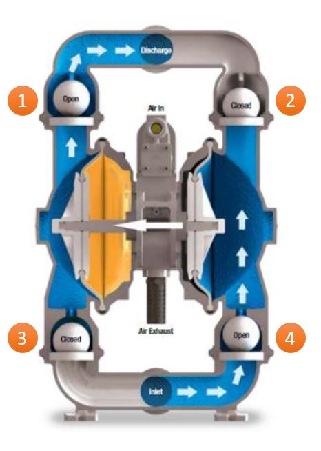 At the end of the pump stroke the air valve switches and compressed air will flow into the left Air Chamber, causing the left Diaphragm to flex. The inlet Check Valve (3) of the left Fluid Housing closes, the outlet valve (1) opens, and the fluid is pumped through the Outlet Manifold. The pump shaft moves left creating a vacuum in the right Fluid Housing. The right outlet valve (2) closes, the right inlet check valve (4) opens, and the fluid flows into the right Fluid Housing. See figure below for illustration.
