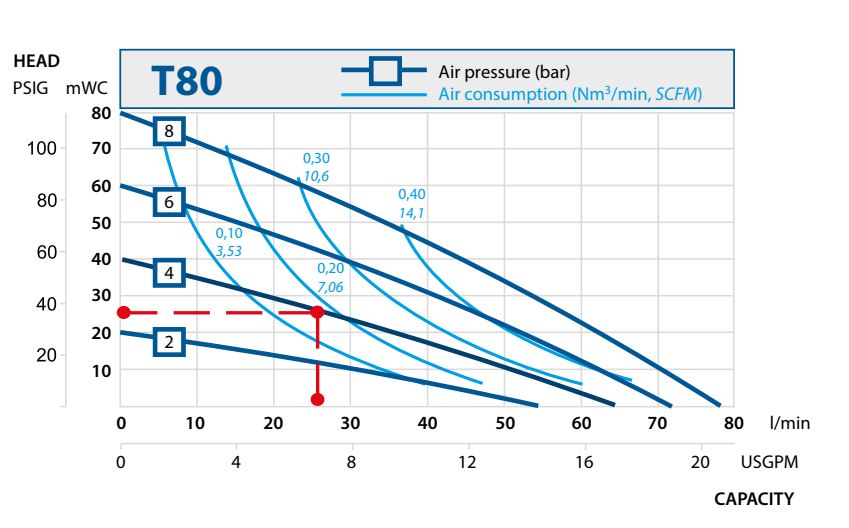 Based on figure the discharge head is approximately 25 mWC. It requires an air pressure 4 bar and will consume approximately 0.2 Nm3/min.