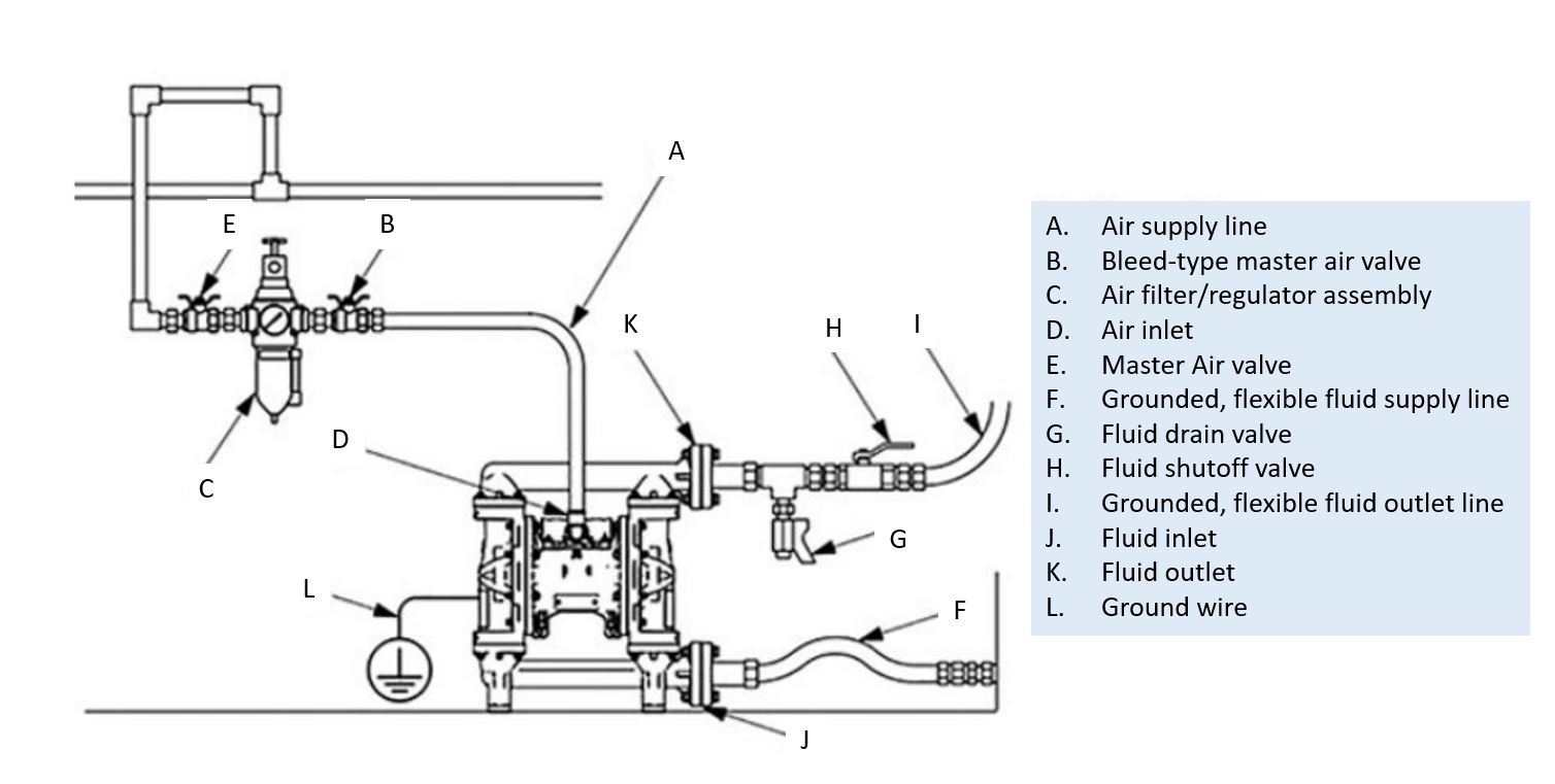 - Ensure proper tubing and piping size, to reduce risk of cavitation. It is also recommended that air-diaphragm pump be installed with flexible inlet and outlet connection instead of hard plumbed. This is because as pump speed increases, vibration increases. This cause increasing the risk of loosening a hard plumb connection, creating potential for leaking.