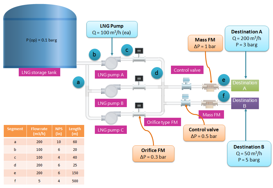 Let say we have a system to transport LNG from LNG flat bottom storage tank to two different destination points at different rate. Rate of LNG at Destination A is 200 m3/h with pressure at its destination is 3 barg. While LNG at Destination B is 50 m3/h with pressure barg.