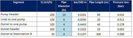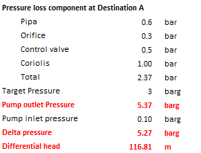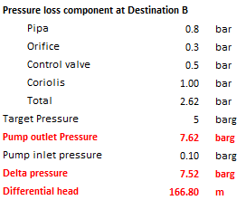 Then, we look into Destination B. We use the same method as we applied in calculating discharge pressure at Destination A. We get total pressure loss is 2.62 barg, slightly higher than that in Destination A. Thus minimum required discharge pressure is 7.62 barg. Differential pressure is 7.52 barg which is equal to 166.8 m.