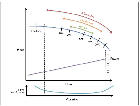 - Preferred Operating Region. It is portion of pump’s hydraulic coverage over which pump’s vibration is within base limit of API 610.