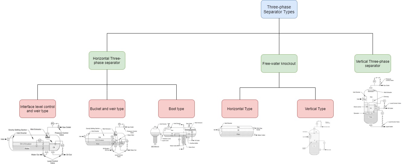 In term of orientation, three-phase separator can be categorized into horizontal three-phase separator and vertical three-phase separator. Free-water knockout is also classified into horizontal and vertical type.