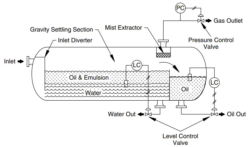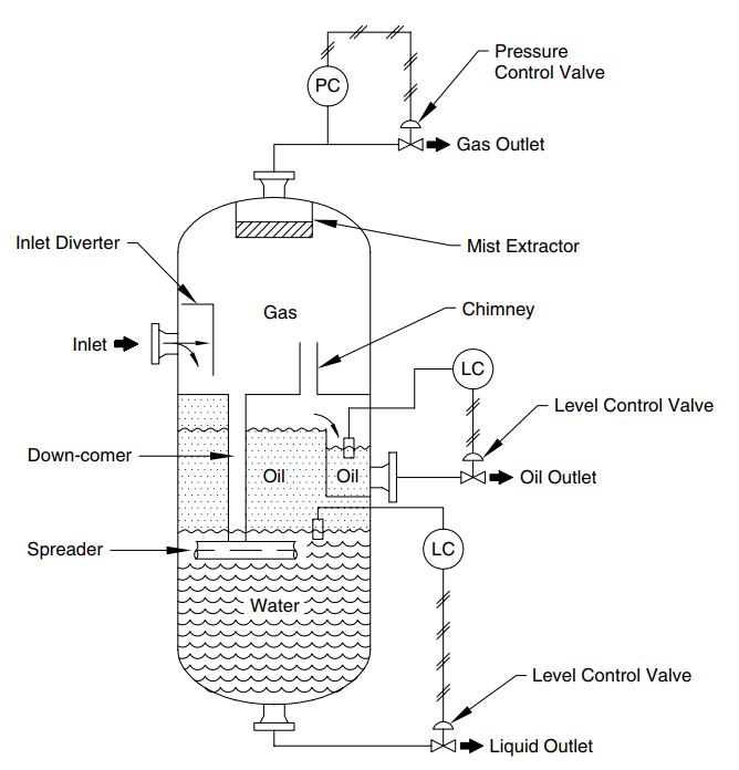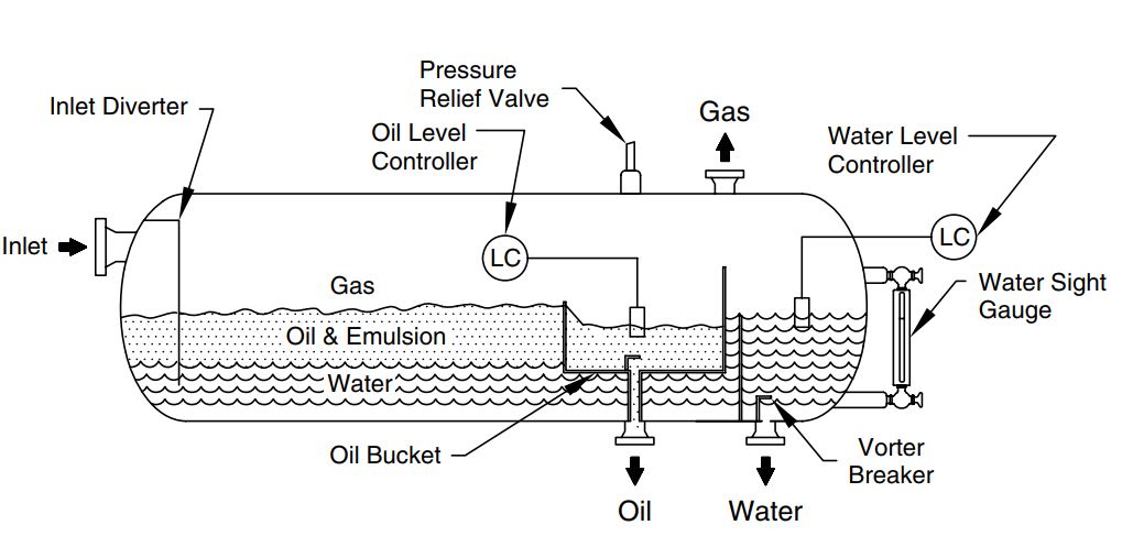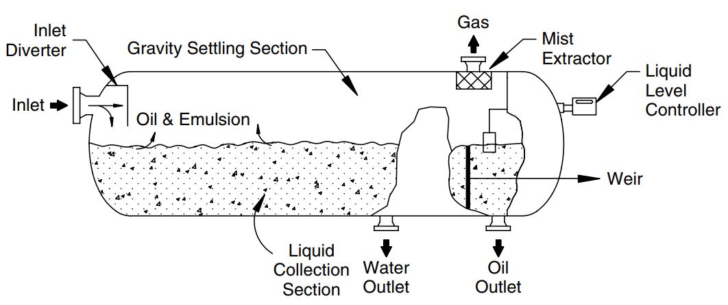 Figure below shows a typical schematic of horizontal three-phase separator. At first, fluid enters the separator and hits an inlet diverter. This sudden change in momentum does the initial gross separation of liquid and vapor.