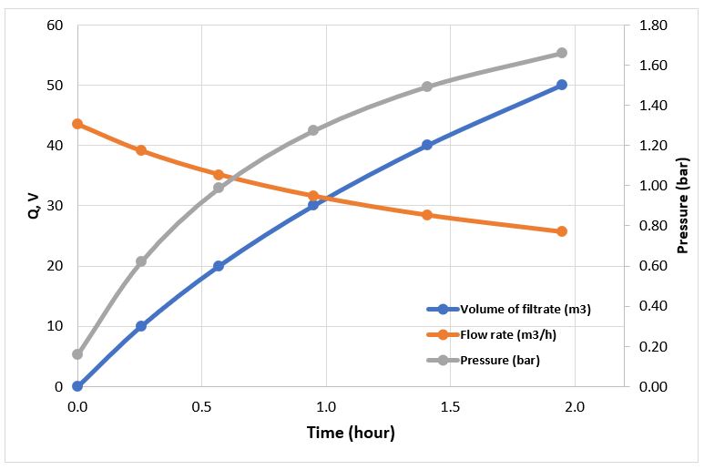 Please be noted that the unit of pressure used above is in bar. It should be converted to Pa by multiplying with 10,000. The rate of filtrate accumulation is also in m3/hour. It should be converted to m3/second by multiplying with 1/3,600.