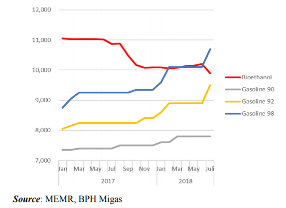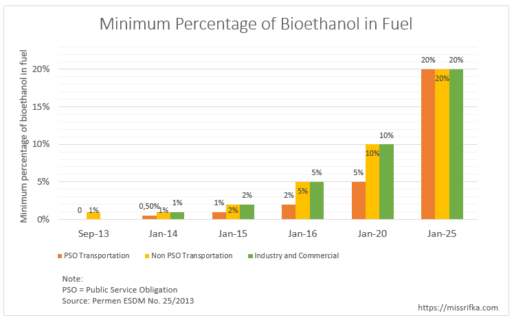 In February 2018, Ministry of Energy and Mineral Resources announced a plan to implement blending of E2 in several big cities, most likely in East Java due to proximity with ethanol producer plants. This program may target high-octane gasoline where the price difference with ethanol is narrower.