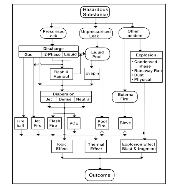 Form of consequence can be dispersion, flash fire, pool fire, jet fire, and boiling liquid expanding vapor explosion (BLEVE). For LNG, spills will be for unpressurized releases with no toxics present, but some release will be pressurized, for example in LNG unloading line.