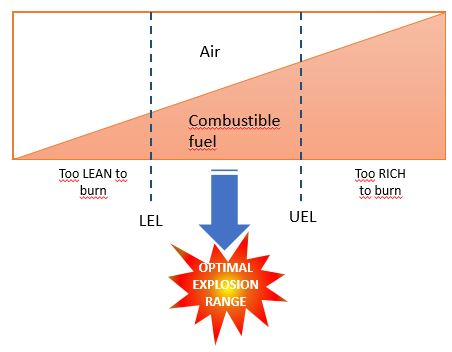 Based on illustration above we can see that Lower Explosive Limit (LEL) is minimum concentration of combustible gas that lead to burn. Below this concentration, gas is too lean too burn. On the other hand, Upper Explosive Limit (UEL) is maximum concentration of combustible gas that lead to burn. Above this concentration, gas is too rich too burn. Concentration between LEL and UEL is optimum explosive concentration.