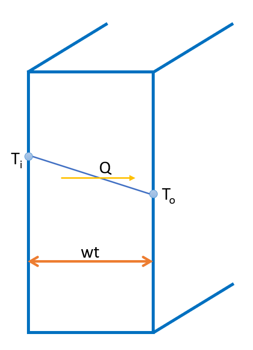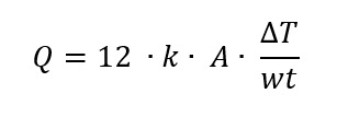 For unidimensional perpendicular heat flow through flat walls, as in heat flow through square or very large cylindrical tank walls, the equation is: