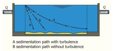 In reality, sedimentation is influenced by turbulence in the tank. When turbulence occurs, a few particles will swirl up and most likely to be removed with the effluent and a few particles will reach the sludge zone earlier. Turbulence unfavorably influences sedimentation efficiency.