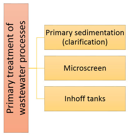 Primary treatment of wastewater includes primary sedimentation (also called clarification), microscreen, Imhoff tanks. In most facilities, primary treatment is used as preliminary step ahead of biological treatment.
