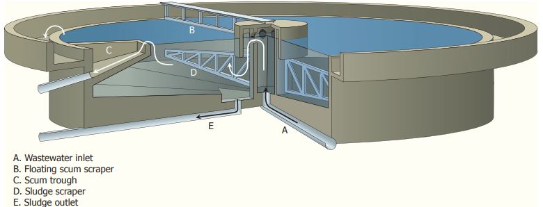 The discharge of the settled sludge usually takes place in a continuous or semi-continuous way. It started with channel or funnels the sludge. And then, sludge is pumping regularly into sludge thickeners. We must avoid build up the sludge in primary tank.