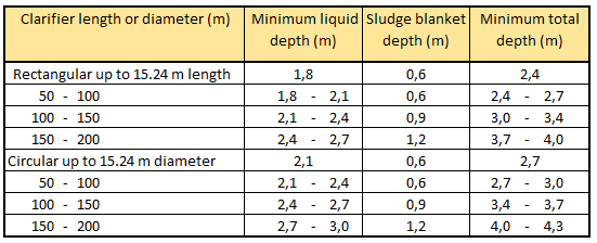 Other source mentioned that optimal depth is between 1.5 m for small tanks and 2.5 m for large tanks. For rectangular tanks, the ratio of depth/length should be approximately 1:20; the width/length ratio should be minimum 1:4 and preferably 1:5 to 1:6.