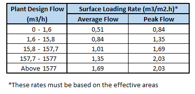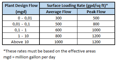 Sedimentation tanks are usually designed for the average daily flow or daily flow equivalent to the peak hourly flow that requires the largest surface area. Tables below can be used as guidance to select the correct surface loading rate. All tank piping, channels, inlets, outlets and weirs should be designed to accommodate peak flows. If specific peak flows are not documented, the peak flow must be based on the average daily flow or average hourly flow increased by appropriate peaking factor. The peak factor is between 2.5 to 4 [6].
