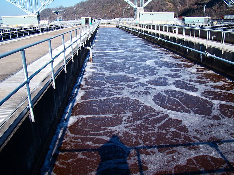 Secondary treatment aerates the wastewater and adds ‘activated sludge’ — a concotion of bacteria that digests organic material in the wastewater [9]