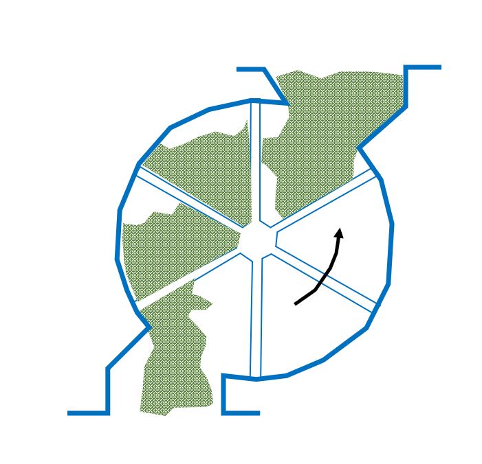 In contrast to drop-through valves, blow-through valves are inserted directly in the conveying line without the use of an intermediary equipment. In this arrangement, the solids are transported to the opposite end of the rotary valve and directly into the conveying line by the conveying gas, which enters the rotary valve from one end and blows through the emptying rotor pocket. These valves are used for sticky materials that are difficult to remove from the rotor pocket.